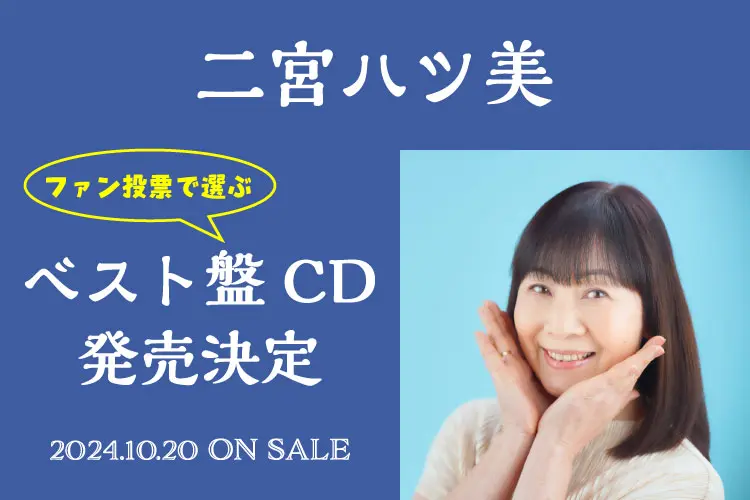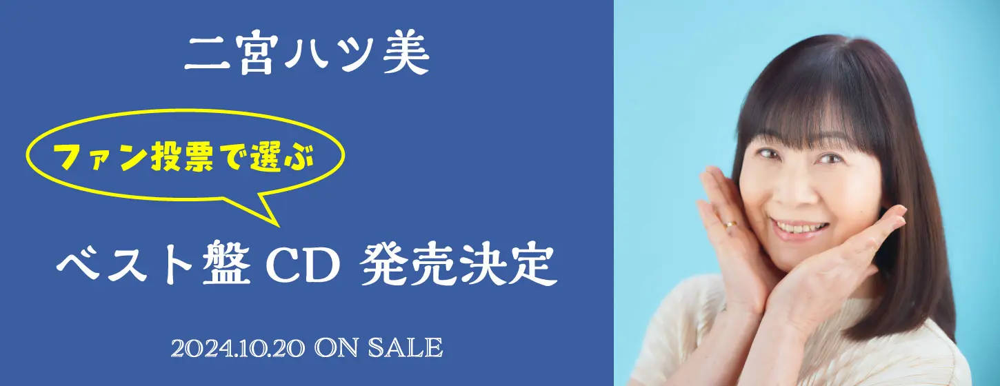 私、二宮ハツ美は、デビューから20周年を迎えました。デビュー曲『さびしいキジバト』から一貫して、ファンの皆様を大切にし、魂を込めた歌唱に努めてまいりました。