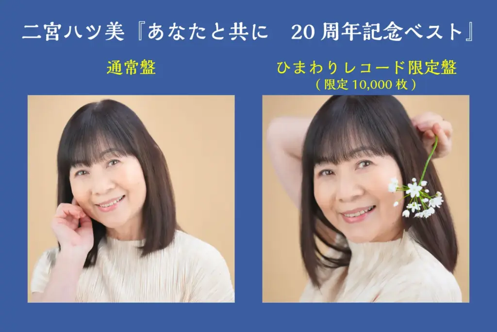 二宮ハツ美が所属する「ひまわりレコード」の公式オンラインショップでは、通常盤とは異なる、オリジナルのジャケットで販売いたします。限定盤はすべて初回出荷分に含まれています。